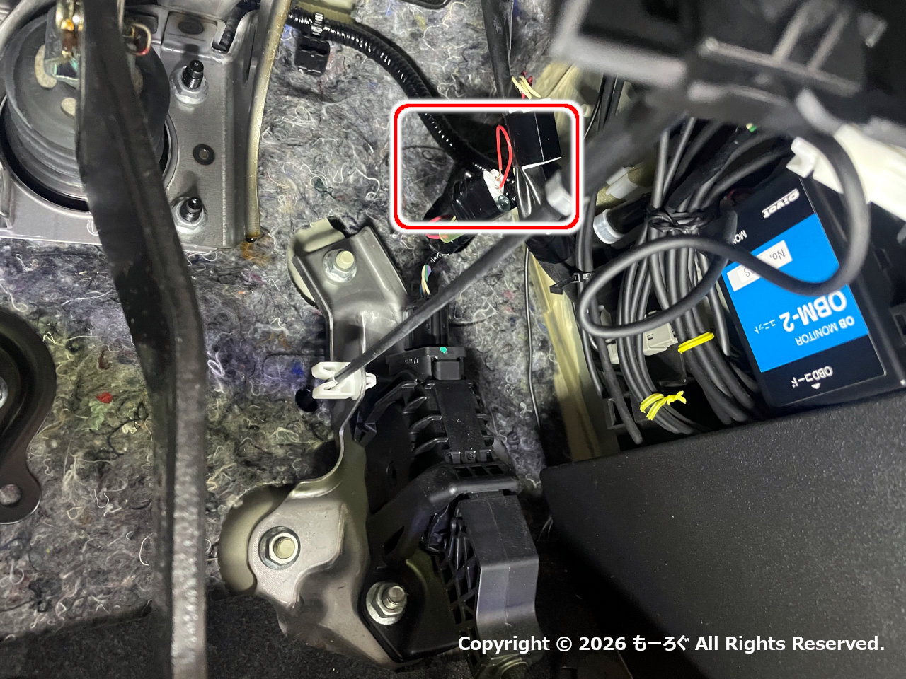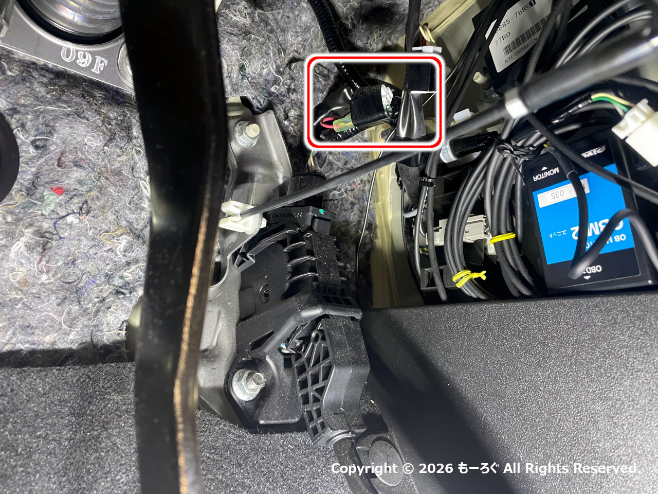 運転席のアクセルペダル上付近に、ESP OFFコネクタがあります。写真赤枠内の白いコネクタ(カプラー)です。