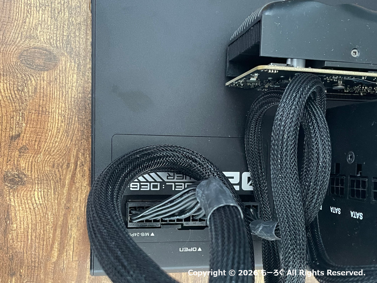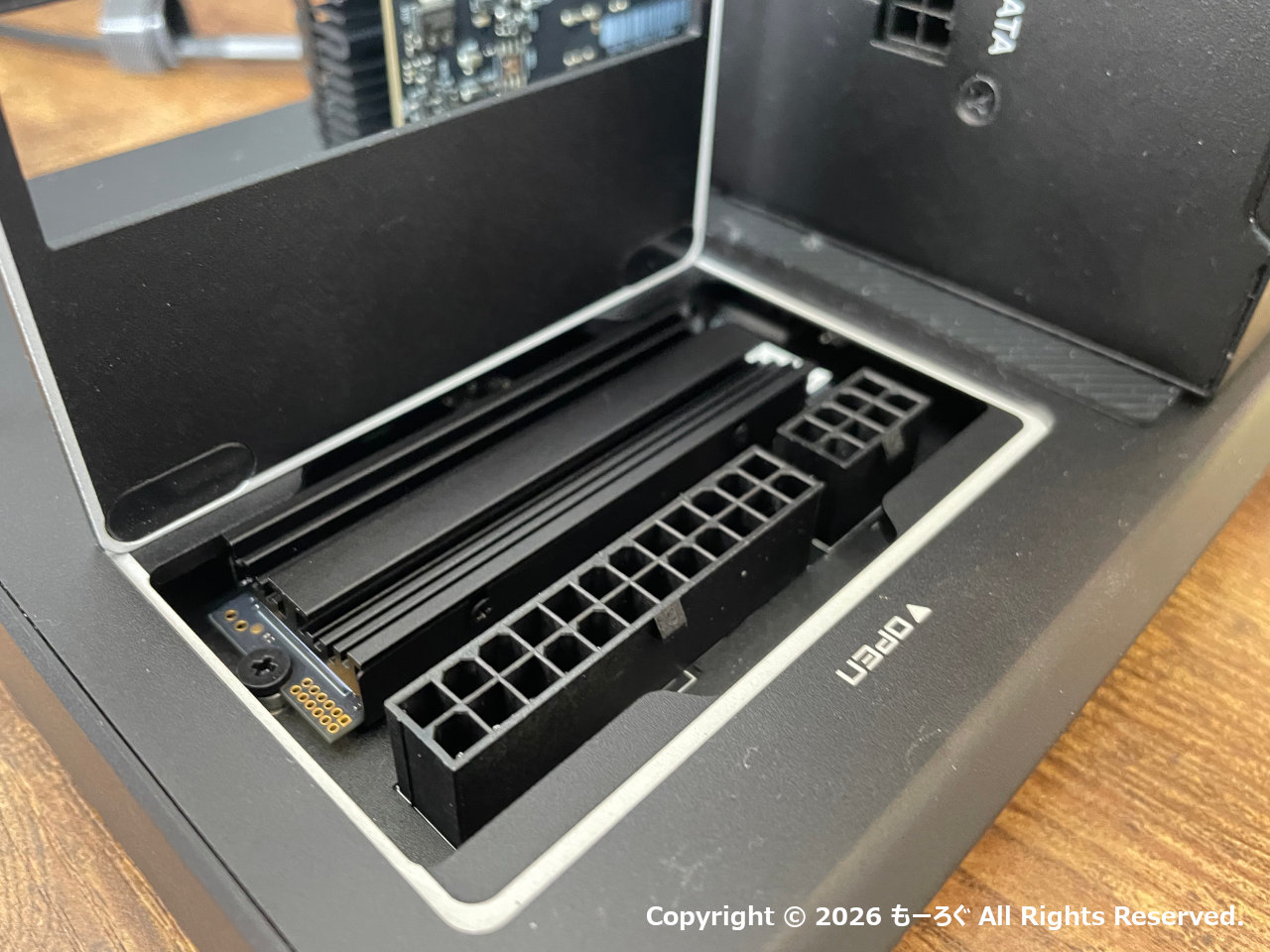 Minisforum DEG2のSSDスロットは、電源を接続する部分のふたを開けると出てきます。