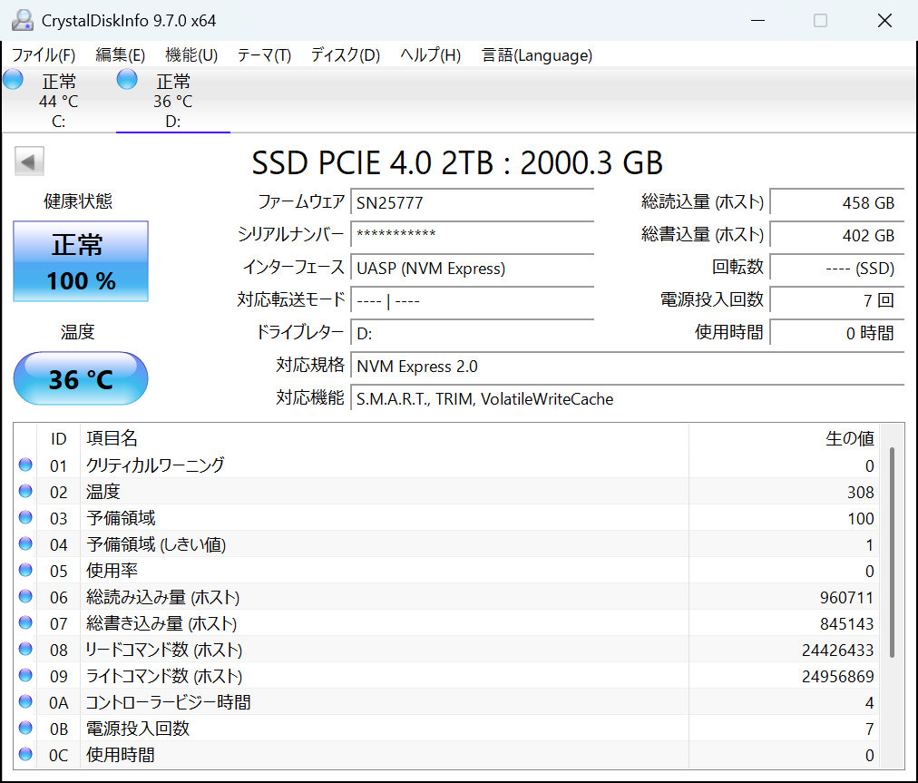 その下の方に、対応規格が「NVM Express 2.0」と出ています。