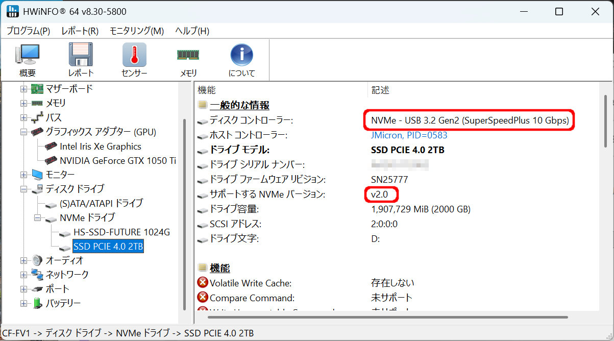 HFiNFOで見たところ、外部との接続は、USB 3.2 Gen2(10Gbps)接続のようです。