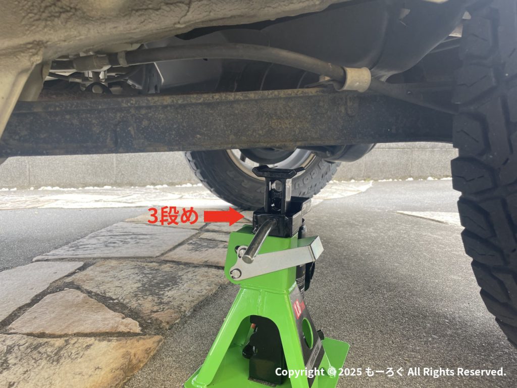 使用したジムニーJB64Wは、タイヤをOPEN COUNTRY R/Tの185/85R16にしているため、純正タイヤよりも、15mmぐらいはジャッキポイントが上がっていると思います。リフトアップはしていません。